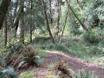 Looking east, photo shows an edge and top of the rail bed running along the hill, next to the marsh. No railroad ties, rail, or other hardware are evident along this rail bed. Fifteen years ago there was an old electrical insulator up in a big cedar tree, which probably carried a telegraph line for the railroad. The cedar has since died and fallen into the marsh.